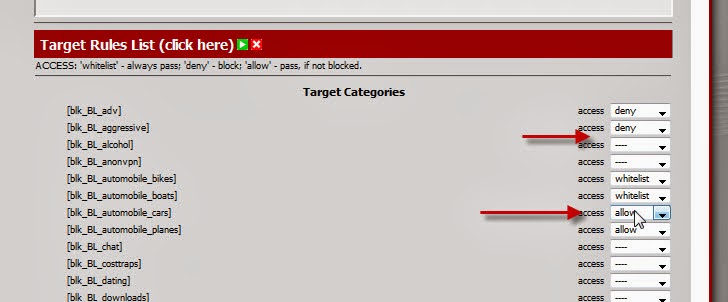 Next click on the common ACL tab, and the click on Target Rules List, and select every rule that you want block or allow, then add a message to the Proxy Denied Error Field, I am currently just using the default one they suggest (look at sceenshot for example), leave redirect mode at Int Error page so it will use the message you type in, tick the Log Check box then click on Save.